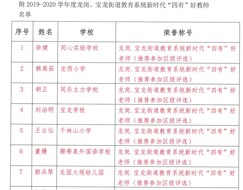 【来源:喜讯:王云仙老师被评为龙岗街道“四有好教师”,并被推荐参加区级“四有好教师”的评选,恭喜王老师! | 发布日期:2020-07-09 】